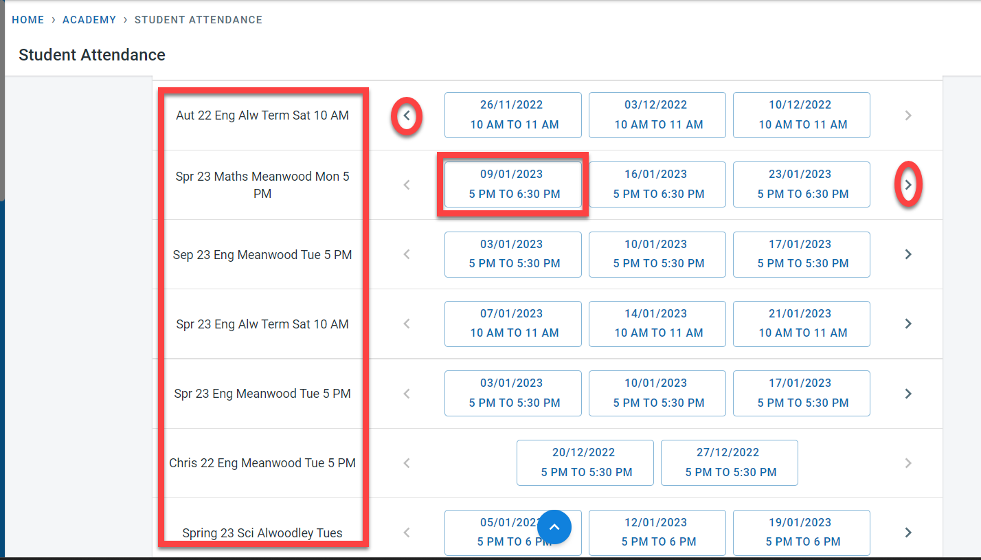 The forward and back arrows in front of and at the end of the sessions can be used to scroll through the different sessions within the class