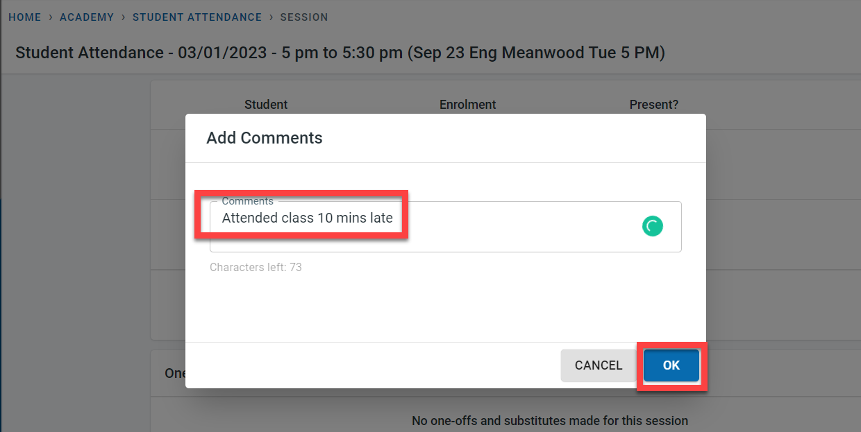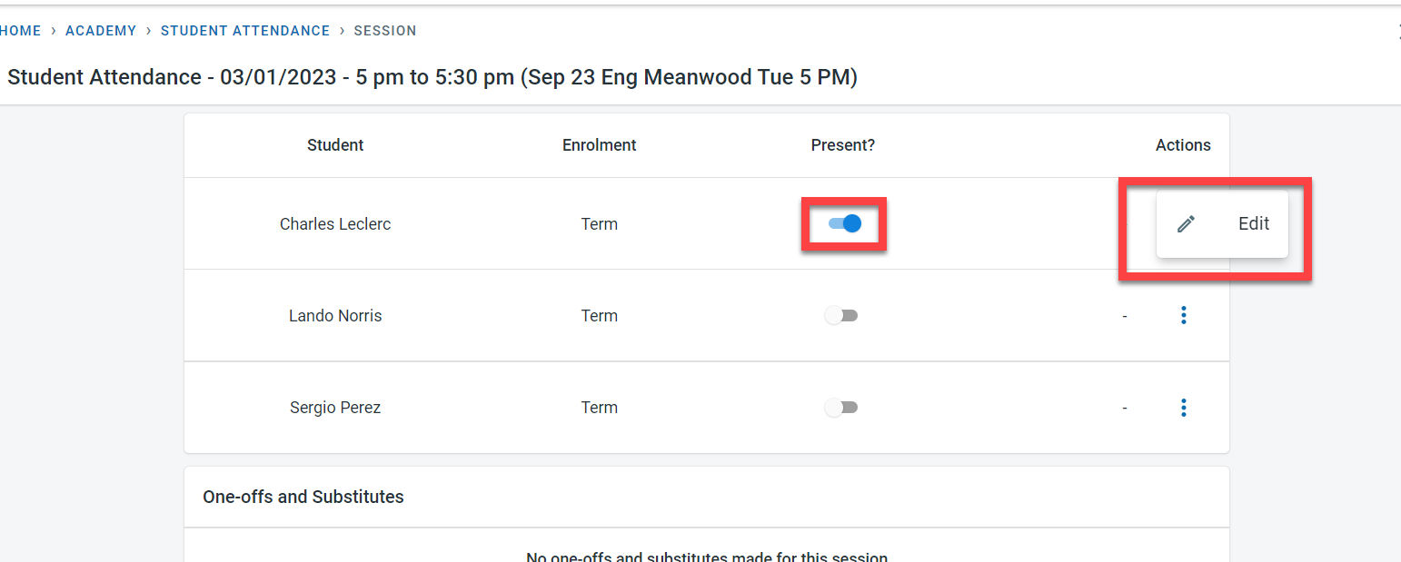 When a student attends the session, toggle the “Present” switch next to the student’s name. It is possible to add comments for a student for the session in attendance. In order to add a comment, click on the three dots under Action. Click on Edit.