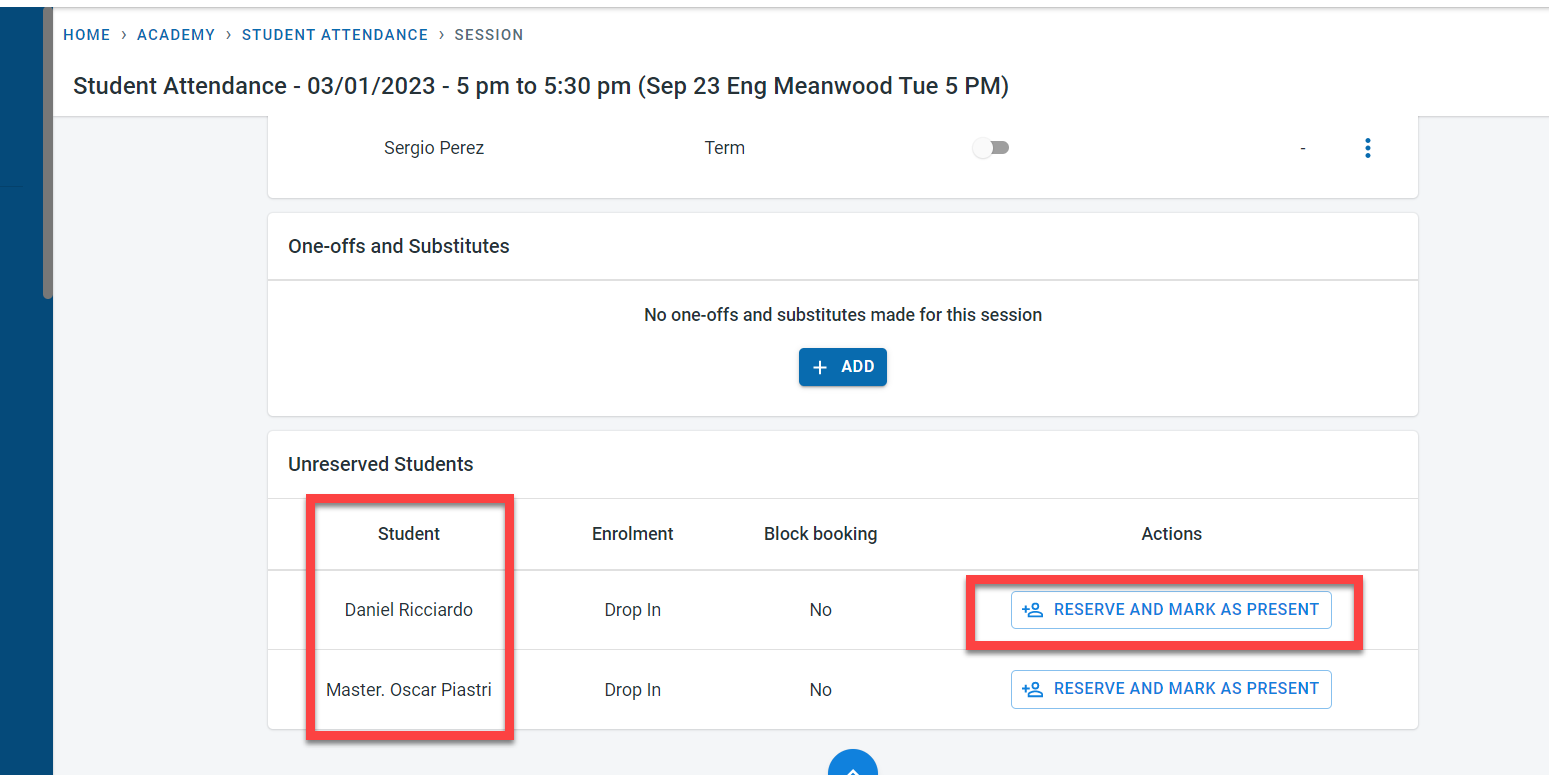 If a drop-in student turns up for the session without a reservation, click on “Reserve and Mark as Present”.