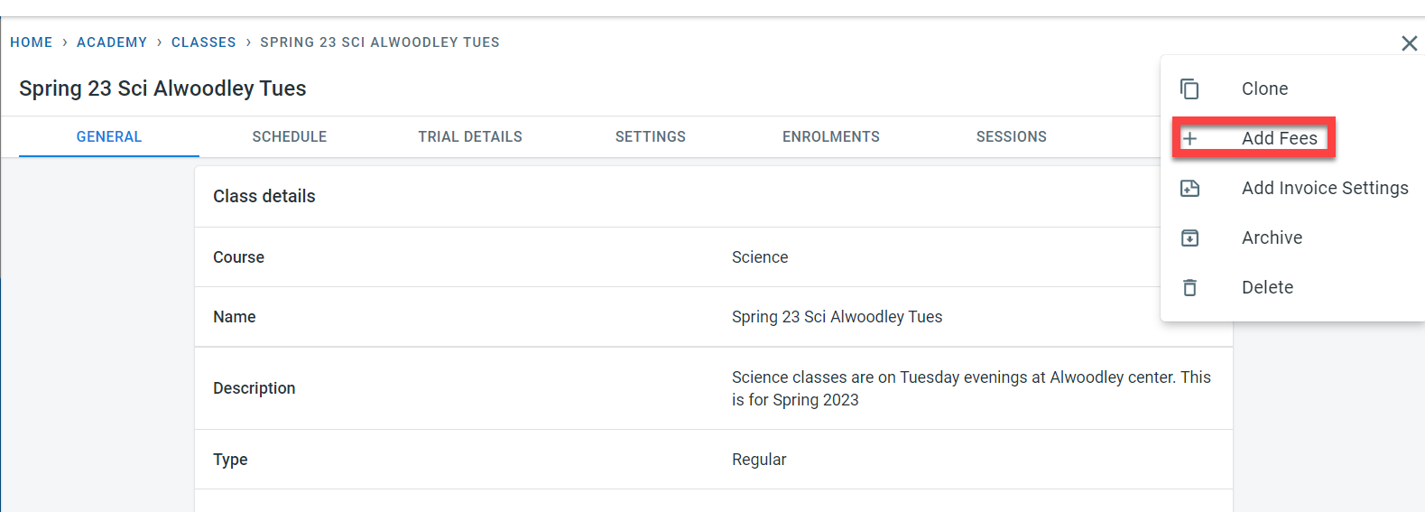 Before adding fees to the class, the class has to be created first.