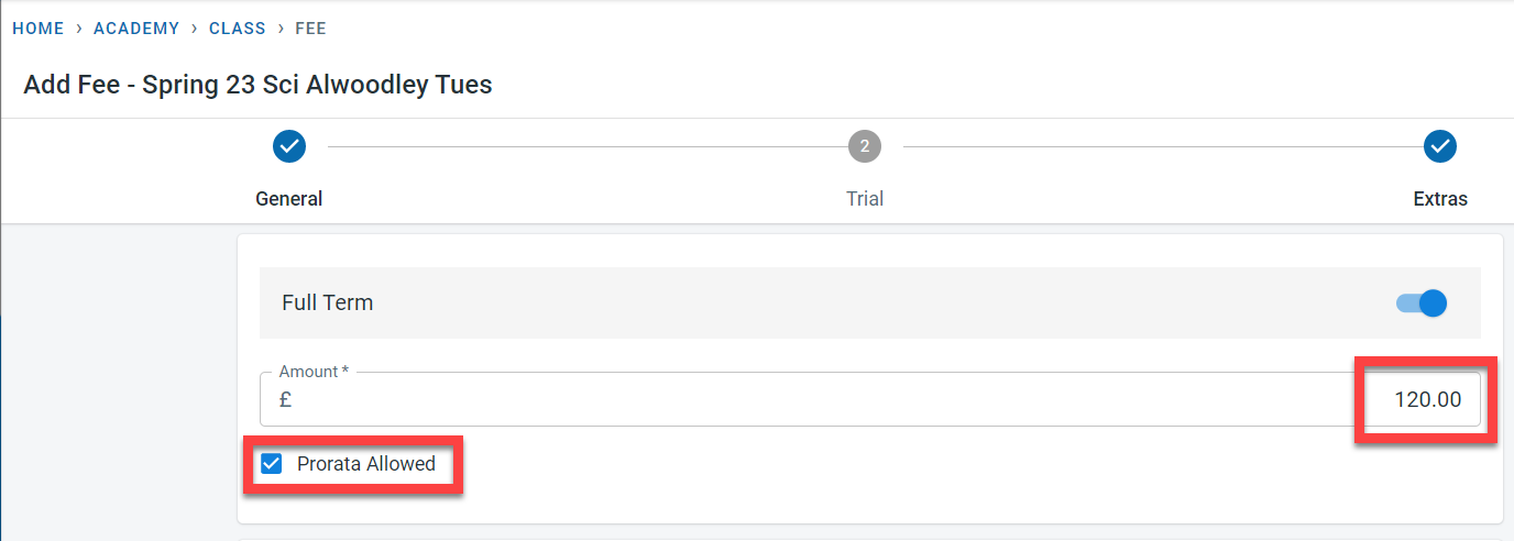 Click on “Next to navigate to the trial fees/extra fees.