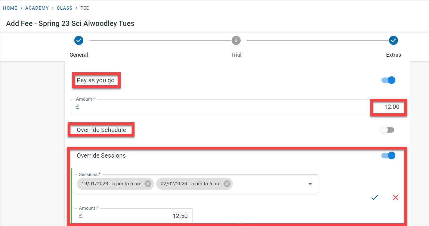 - Override schedule - this could be used to override the fees for a particular schedule within the class. For example, sessions in the class happen every Monday and Wednesday. The PAYG fee for the Monday class is 12£ whereas the fee for the Wednesday session is 12.25£. In this case, set the amount in the Pay as you go section to 12£. Activate “Override Schedule” -select the Wednesday sessions and set the fees to £12.25