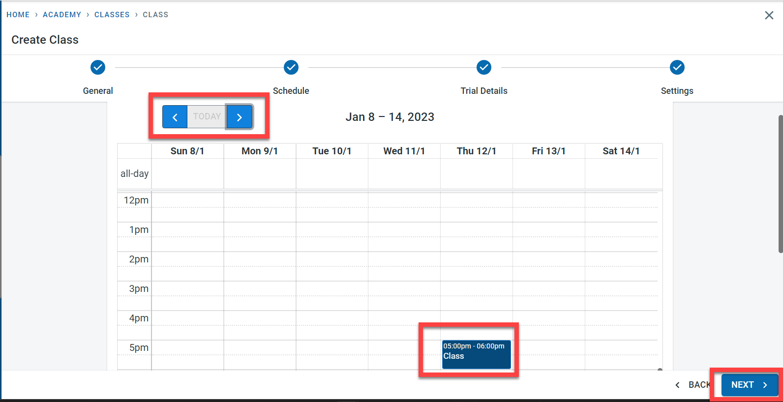 It is possible to navigate between the different weeks within the term using the navigation buttons next to the week definition displayed. Click on “Next” to move to the “Trial Details” Tab.
