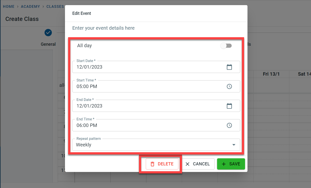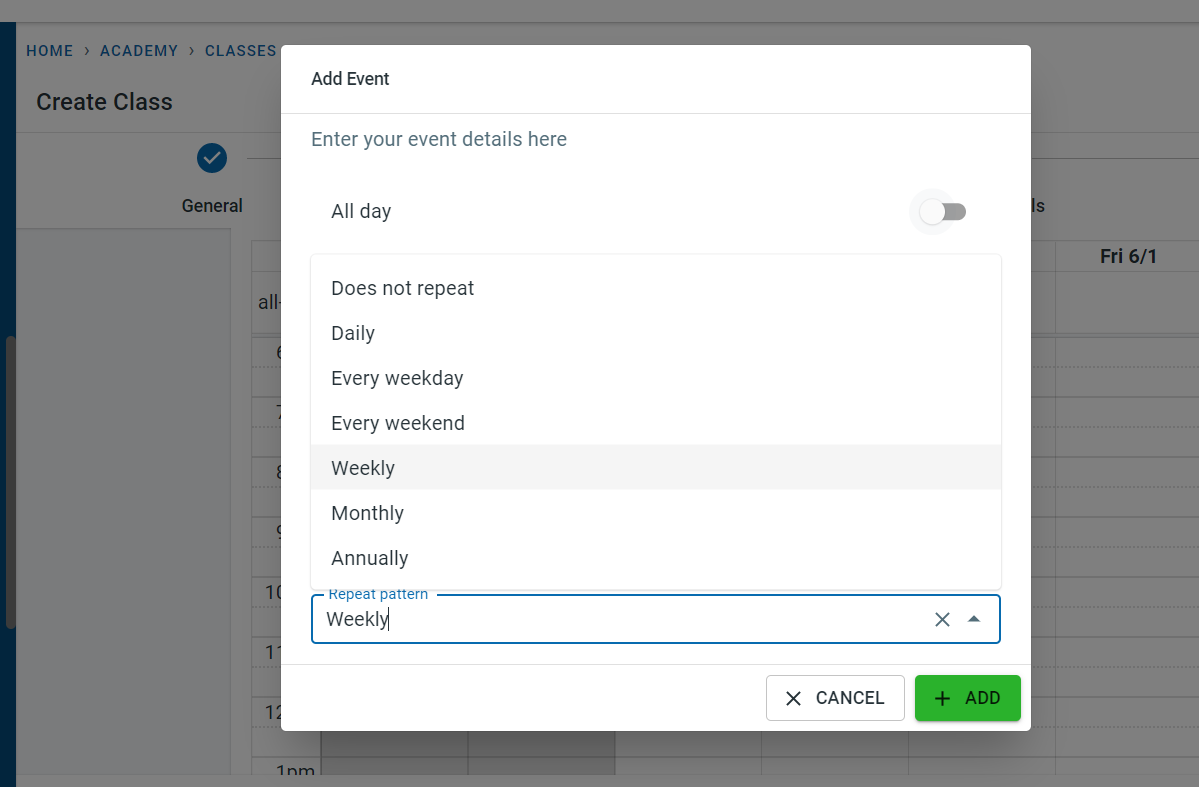 In order to allow subscription fees at the class level, switch on the “Subscription allowed”. Please note this is not relevant to the subscription defined at the academy level.