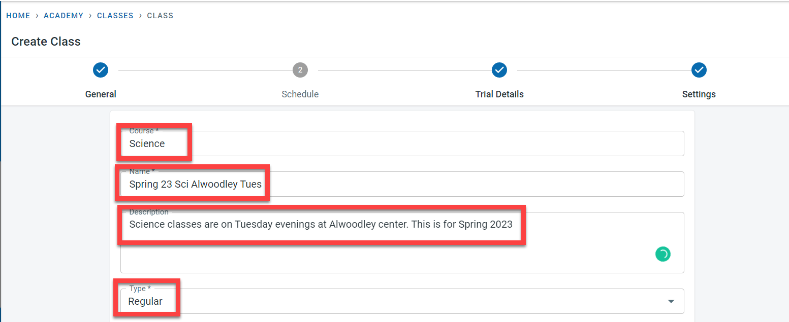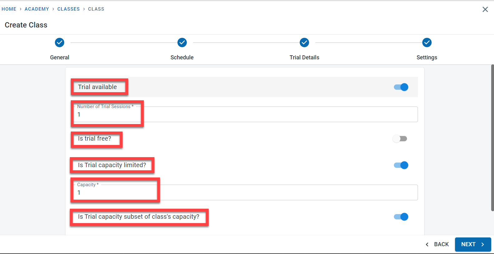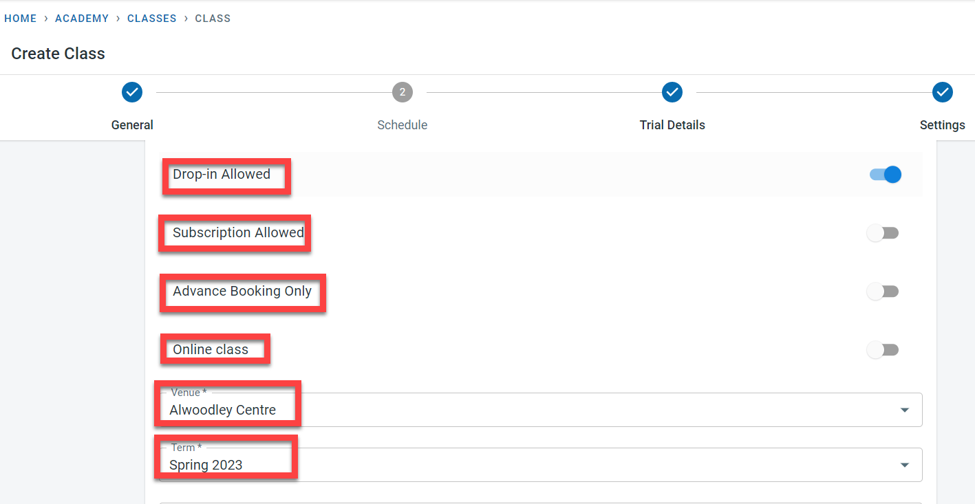 If trial sessions are offered for the class, activate the “Trial available” field.