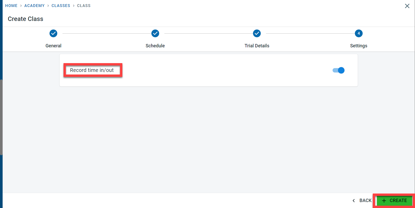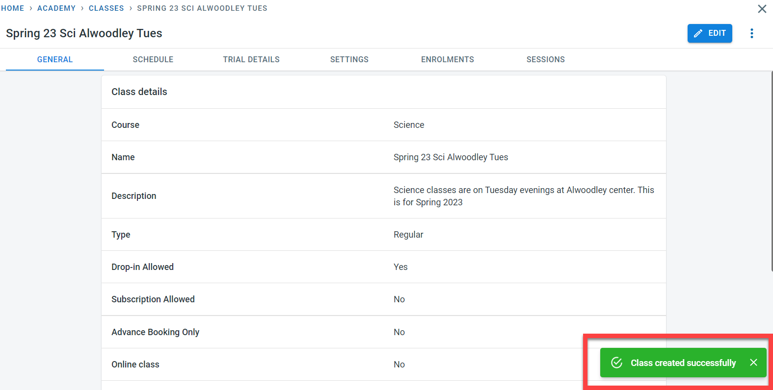 Click on “Create” to save the class. A success message will be displayed only the class is created.