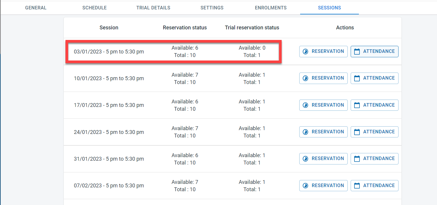 Once the class is created, click on the “Sessions” tab. Over here it is possible to see all the individual sessions created for the class. For each session, it is possible to see the total spaces and the space available for each of the sessions along with the trial reservation space and trial space available.