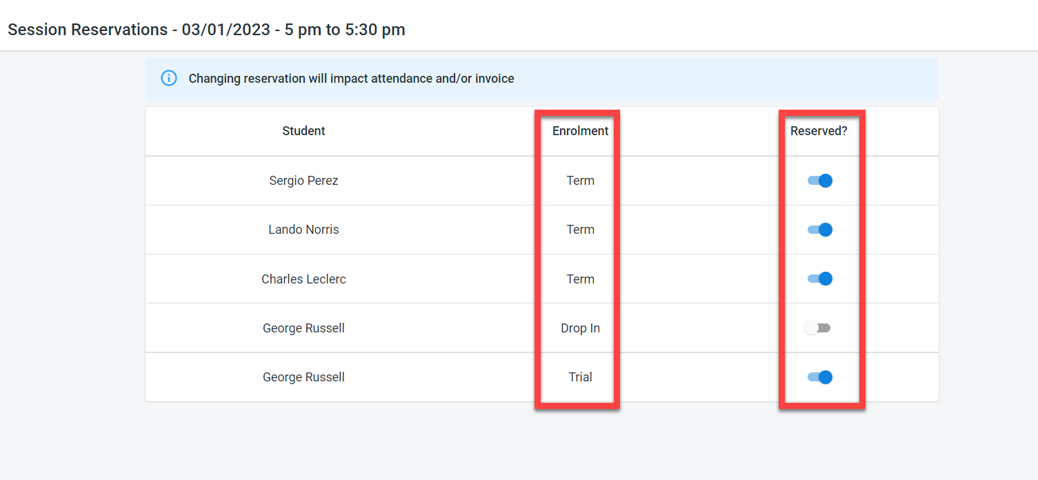 By clicking on the reservation button next to the session, it is possible to view the students who have enrolled in the session along with the enrolment type per student. It is possible to amend the reservation for the student for the session from this screen.