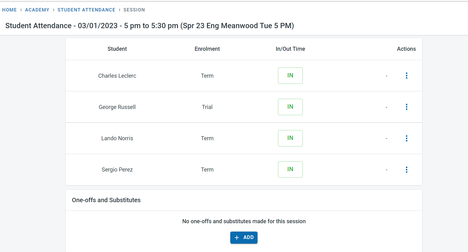 By clicking on the attendance button next to the session, it is possible to navigate to the attendance screen for the session.