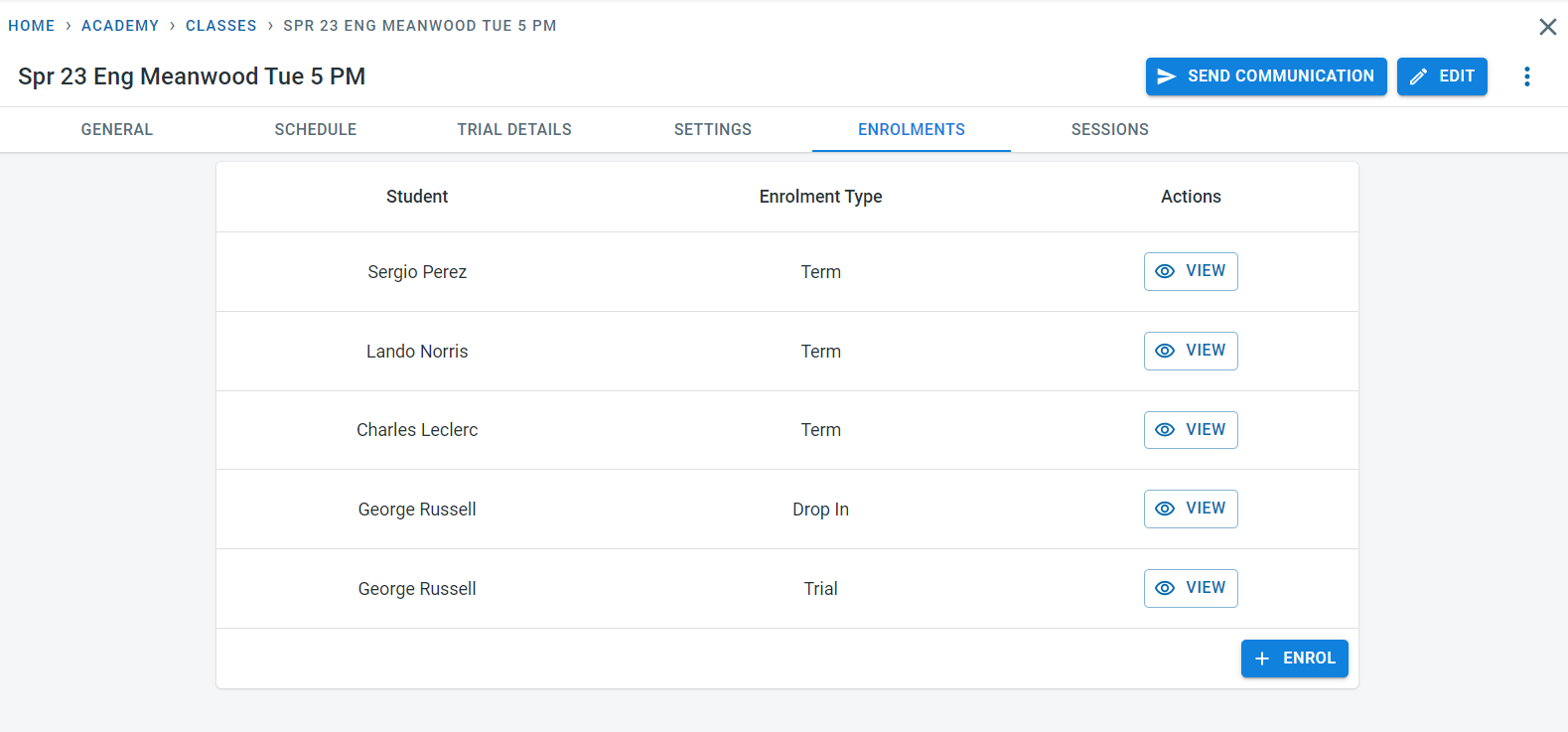 From the enrolments screen, it is possible to view the students who have enrolled in the class.
