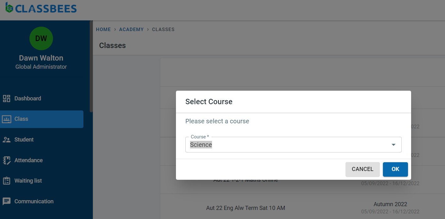 If there are multiple courses defined in the academy, there will be a popup to select the course for which the class is been created. Click on “OK”.