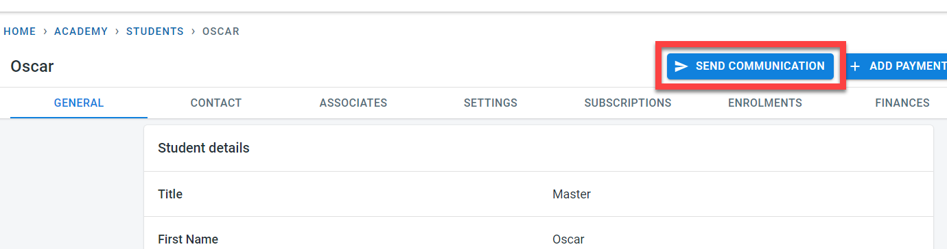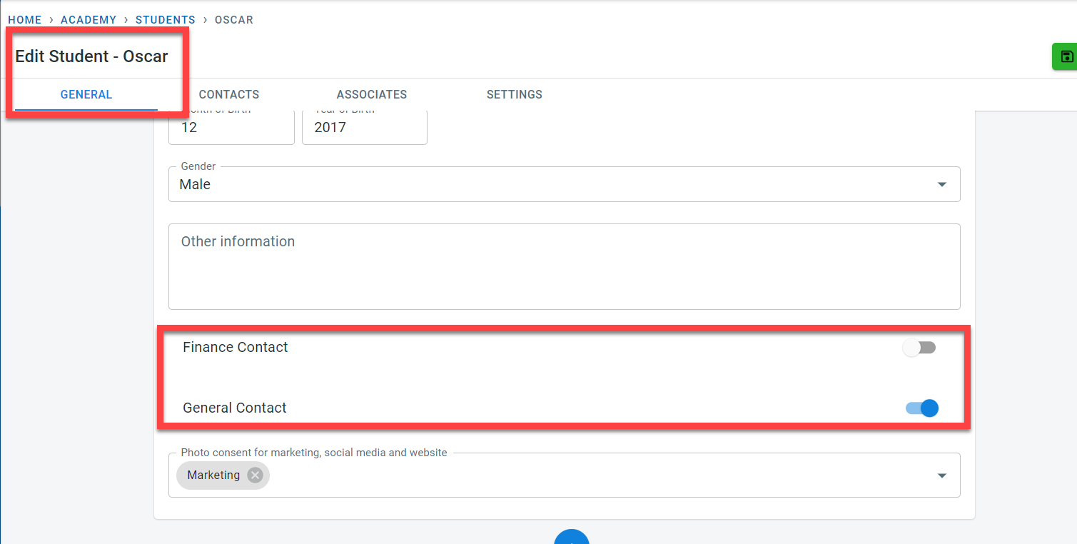 When a student is created, it is possible to specify if the student has to receive general communication and finance communication by toggling the switches in the student’s general screen