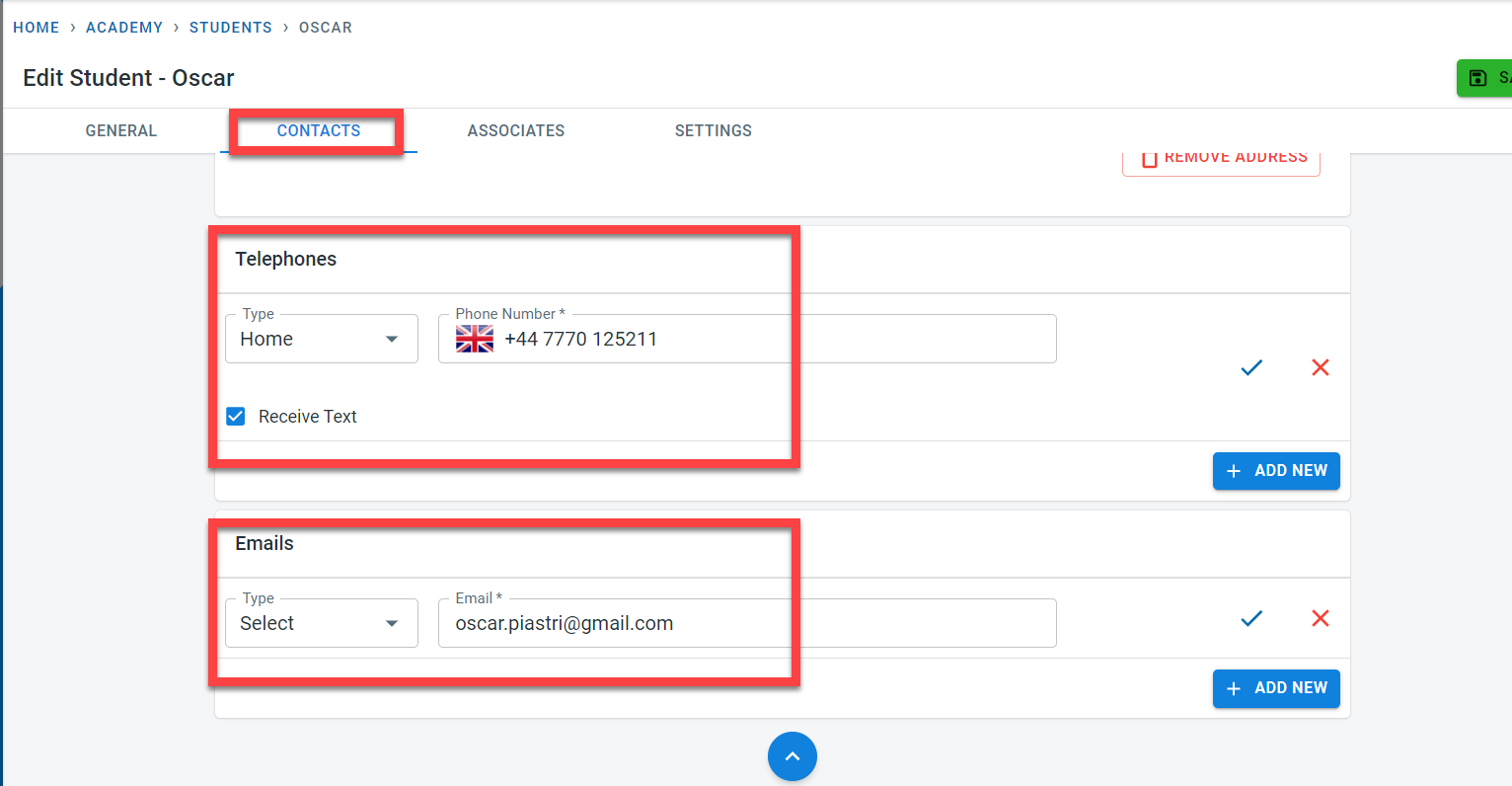 Contact details can be maintained for the student and also for the associates.