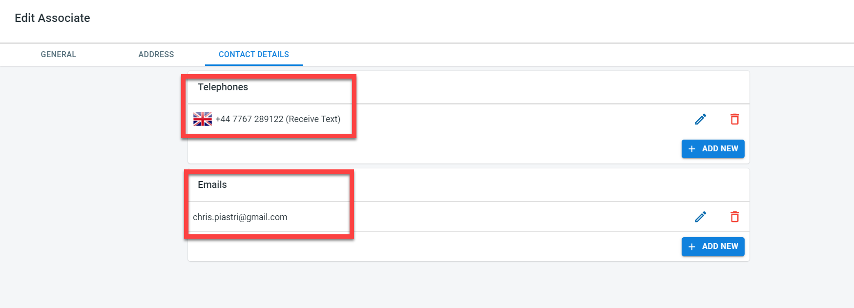 Contact details for the associates will be captured as part of the associate setup