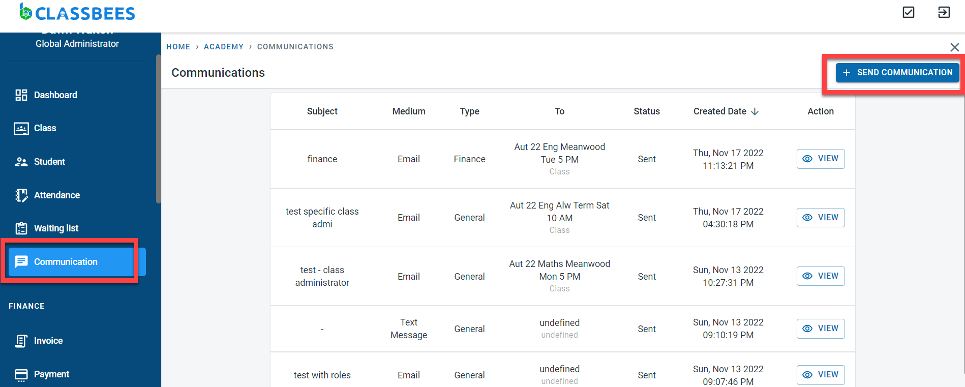 Click on “Communication” in the main menu. Click on “Send Communication” to start a new communication.