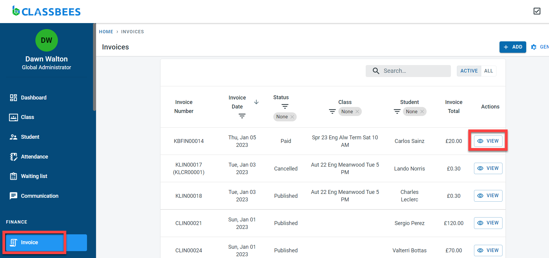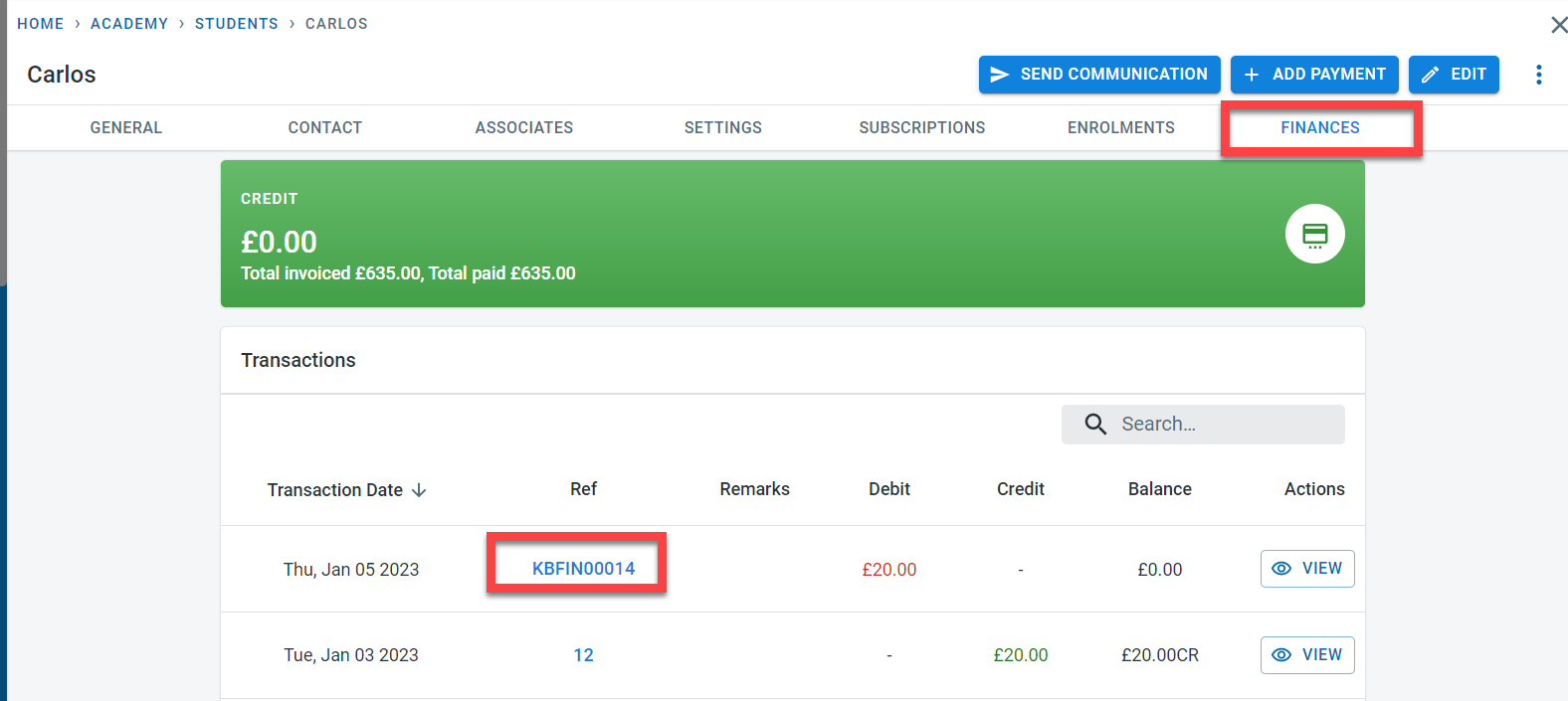 Select the invoice. An invoice can be selected from the student (Student –> Finance –.> Click on the Invoice number)