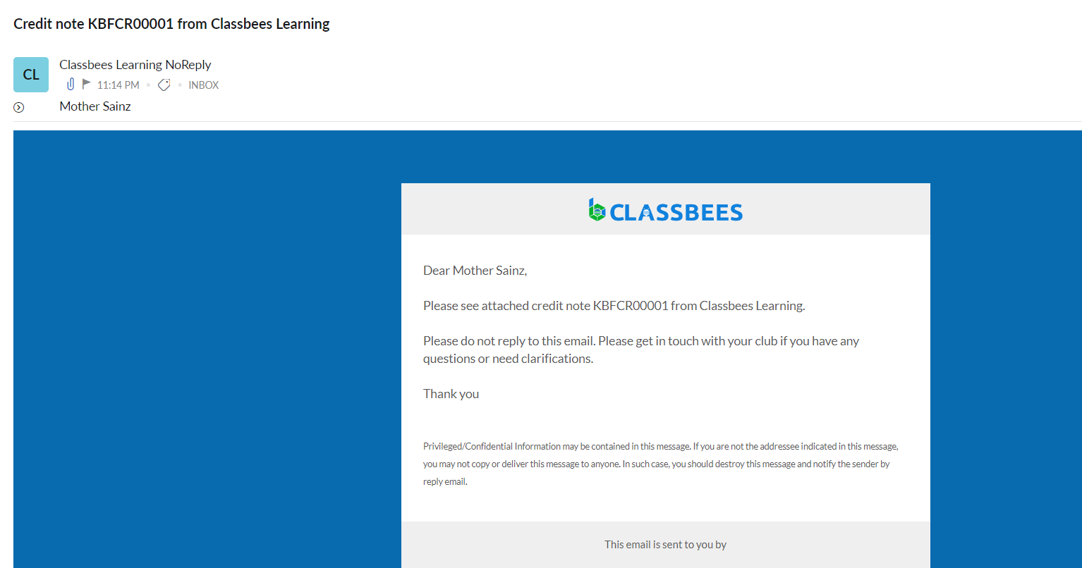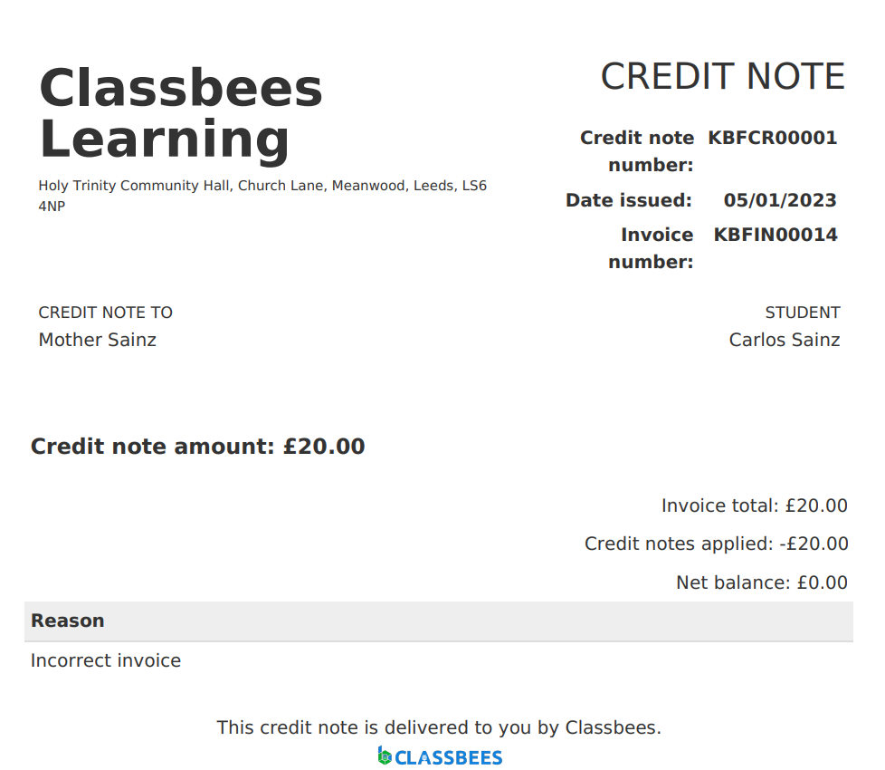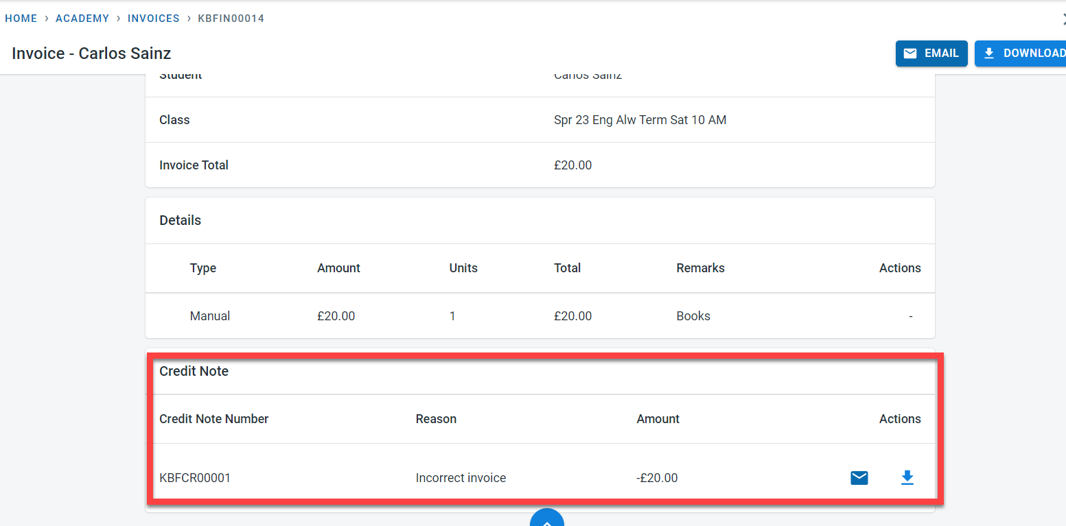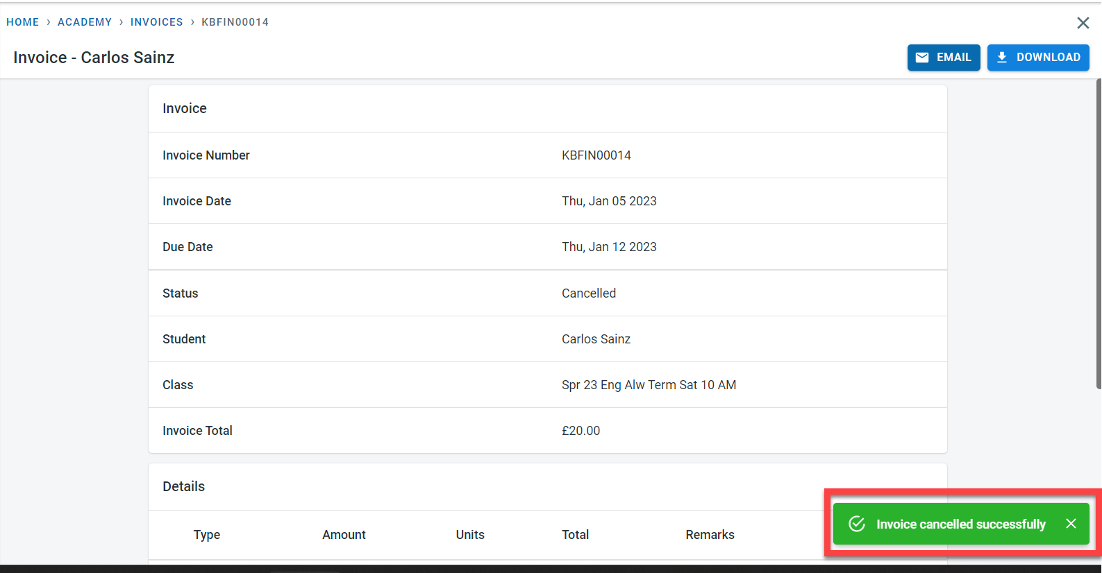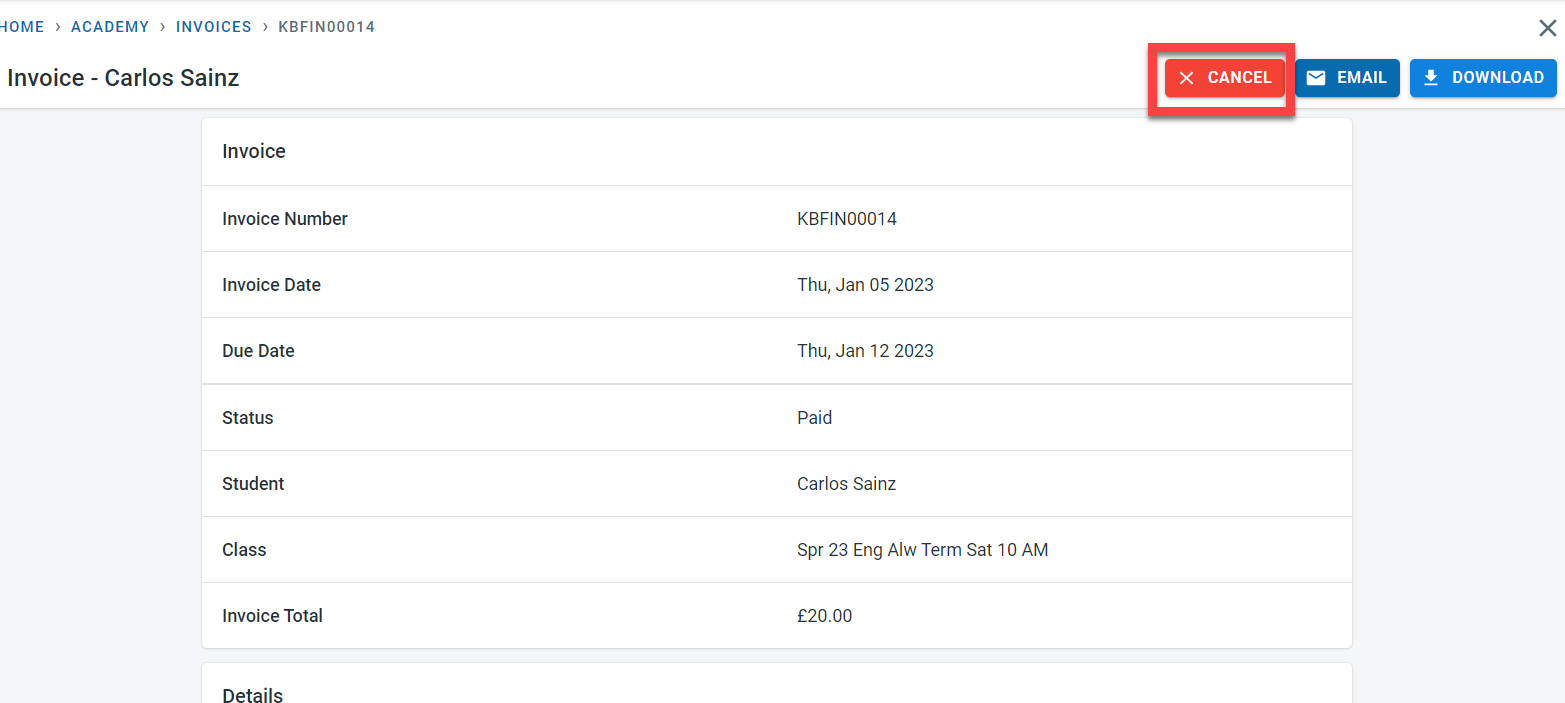 An email would be sent to the finance contact (as per academy and student setting) when the invoice is canceled
