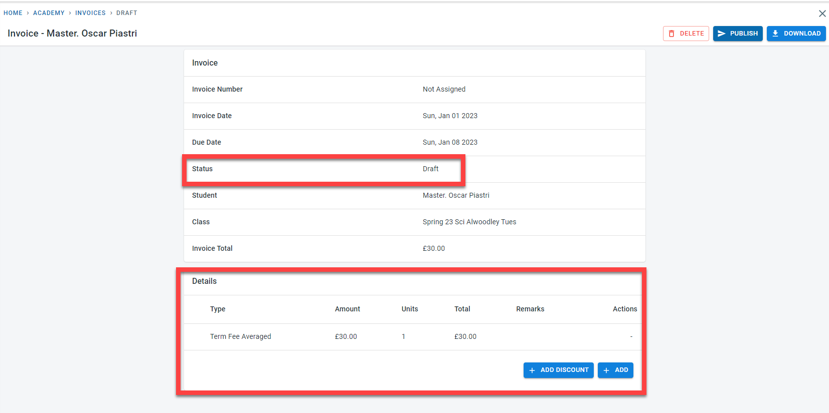 - The first setting is the invoice setting for the class that the student is enrolled in. The setting here controls the details displayed on the invoice and the payment terms in dates. The setting over here also controls how many days before the invoice date should the draft invoices be generated and also when the invoice should be published. The first and last dates for the invoices for the class along with the frequency in which the invoice should be generated for the class.