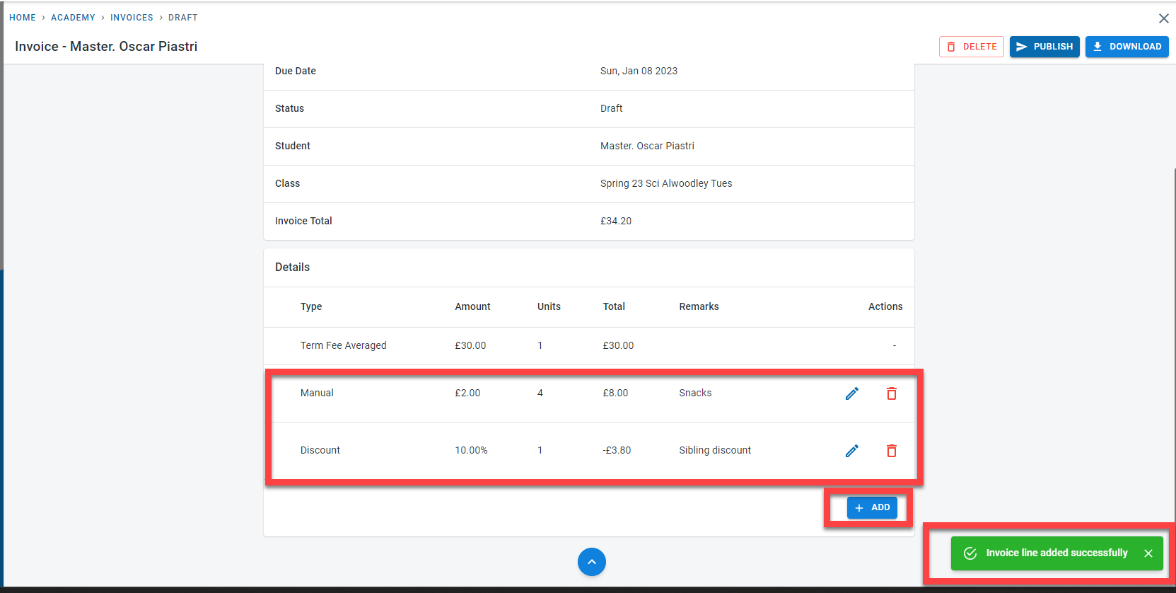 When the invoice is in draft status, it is possible to add extra line items as well as discounts.