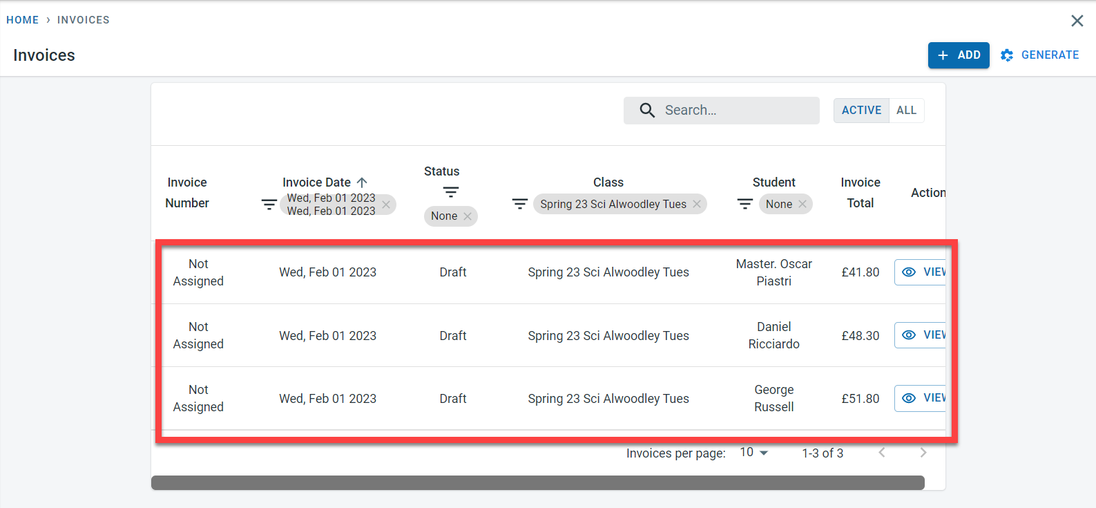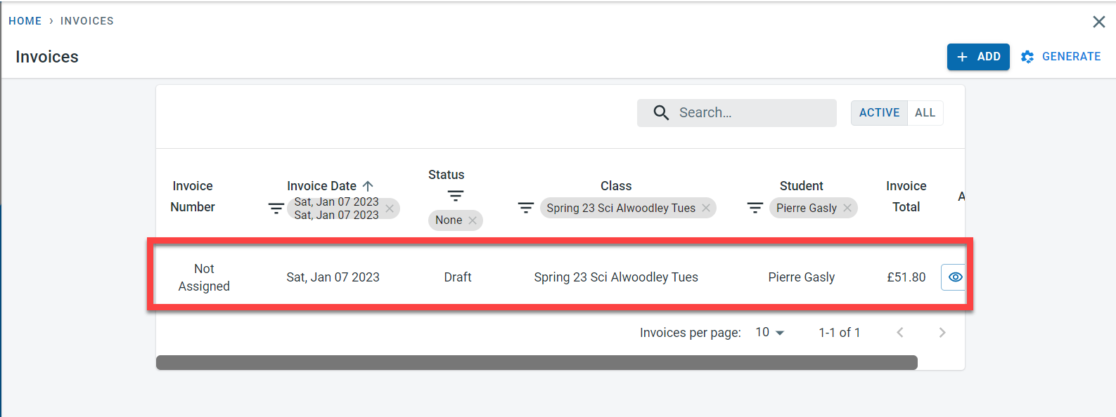 To manually generate the subscription invoices for enrolment, navigate to the invoice screen. Click on “Generate”