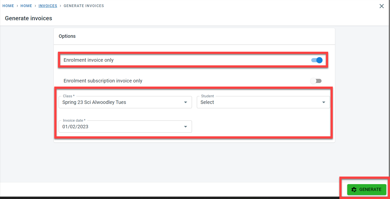 In the “Generate invoices” screen, Select “Enrolment invoice only” and then select “Enrolment subscription invoice only”