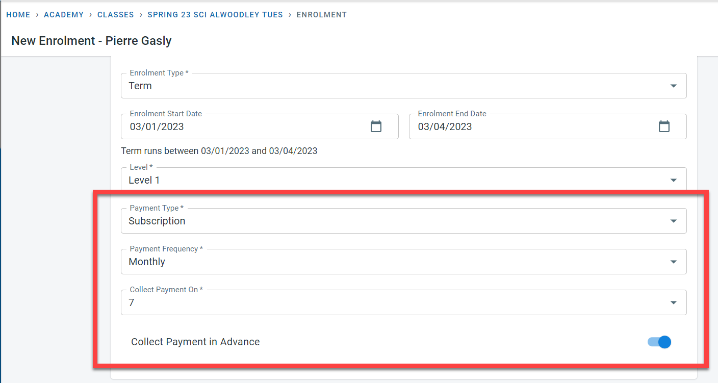 Once the subscription fees are defined for the class, for term time enrolment, it is possible to select the payment type as subscription.