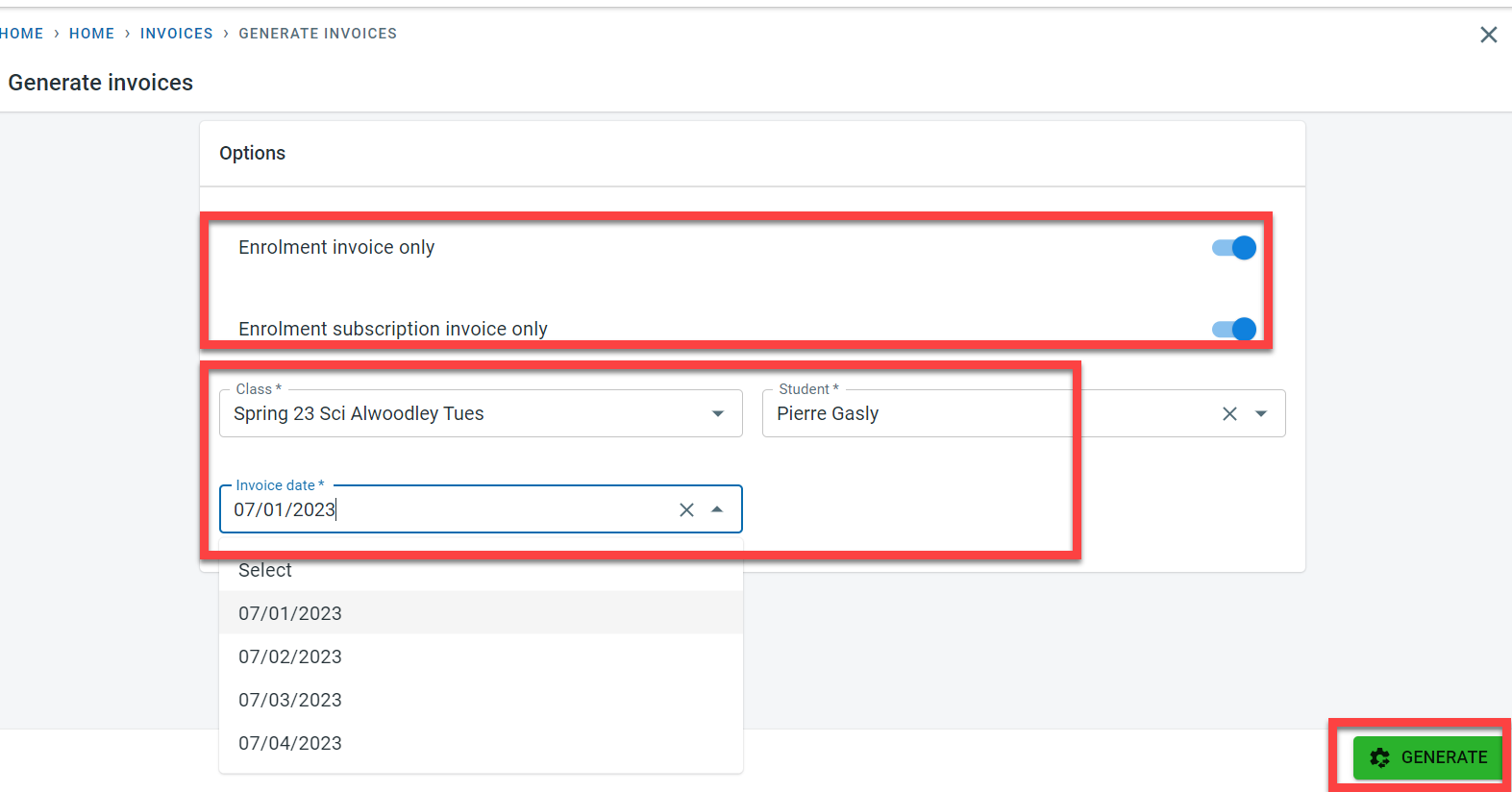 Then select the class, the student, and the invoice date. The invoice date is populated based on the date entered in the “Collect payment on” field during the student enrolment to the class. Click on “Generate”.