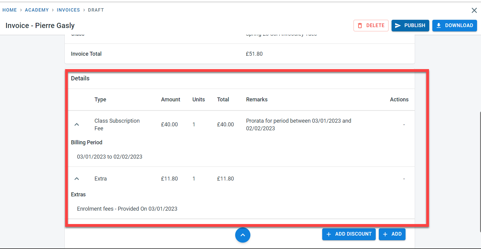 For enrolment-based invoices, the invoices are generated based on the classes that the student is enrolled in. This type of invoice is generated only when the student is enrolled in the class.