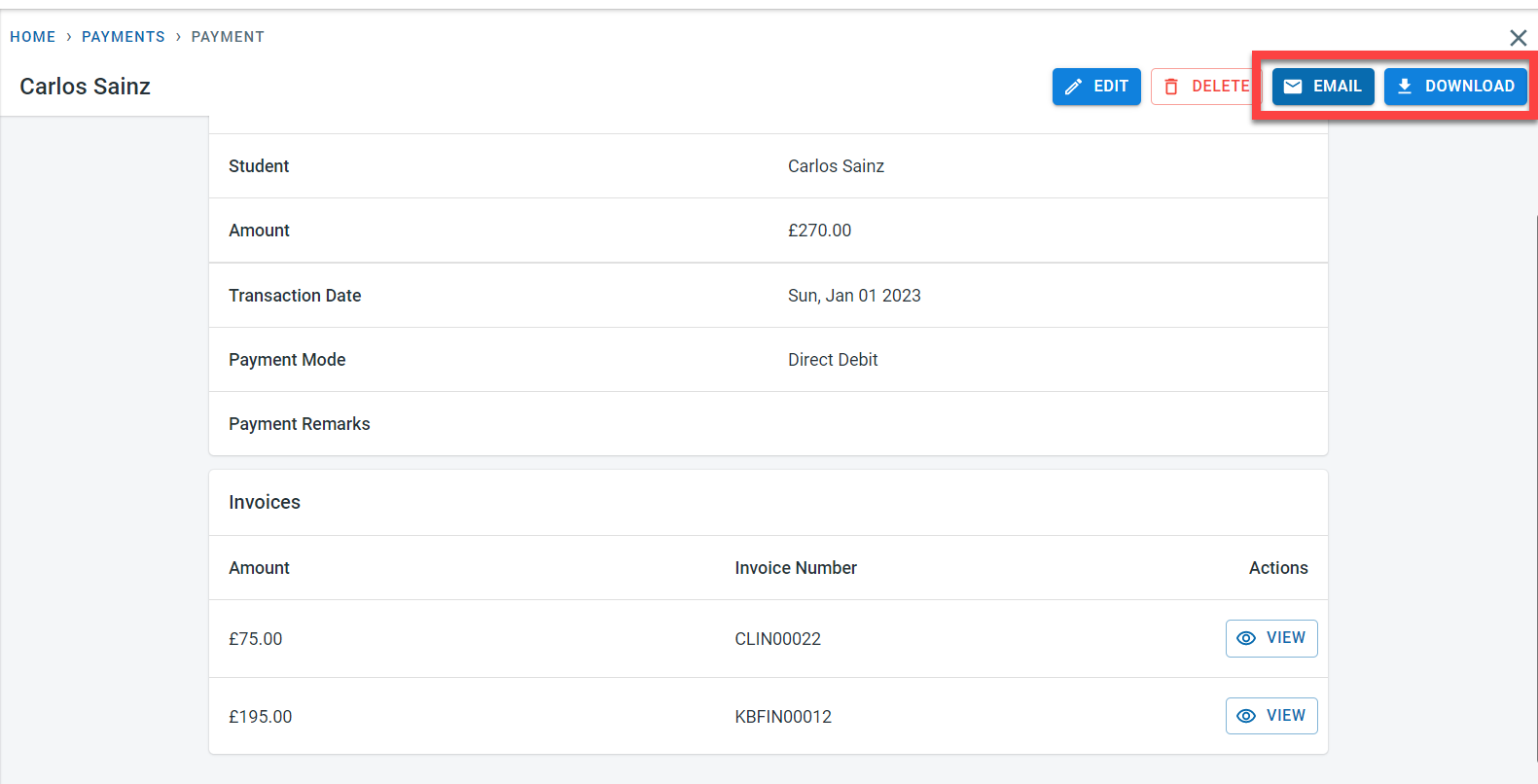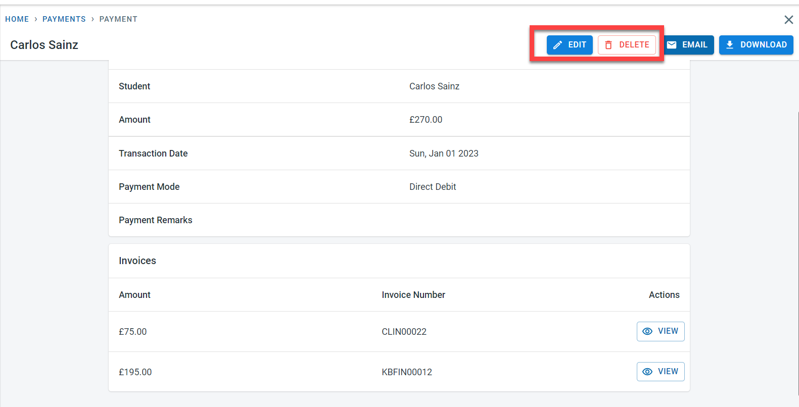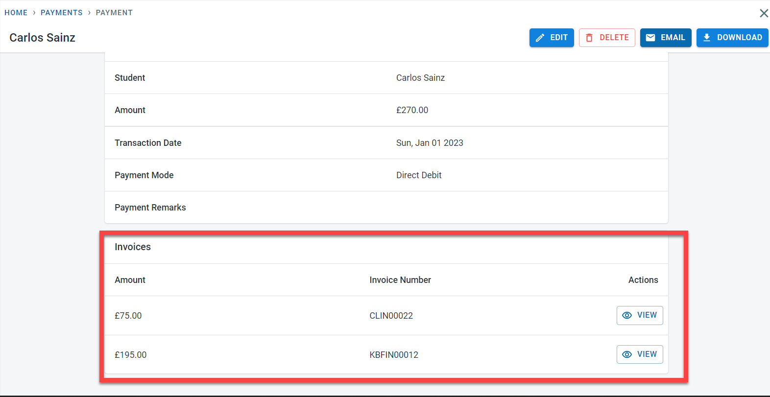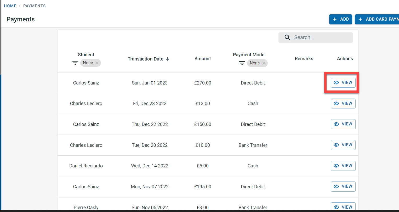 All the payments recorded in the system will be visible on the payment screen. Click on View next to the payment to see the details