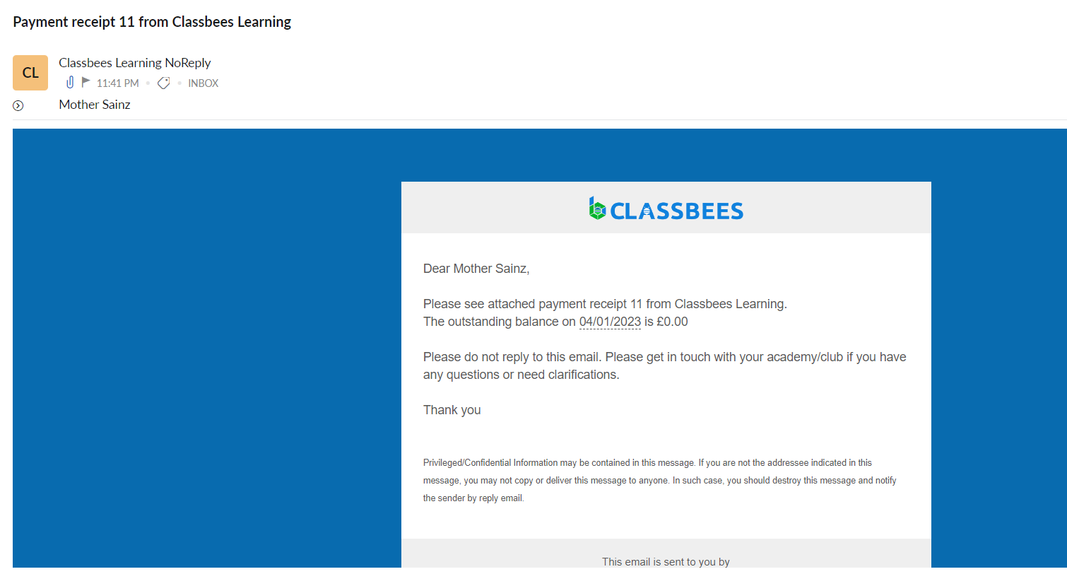 A sample of the payment email sent is shown below