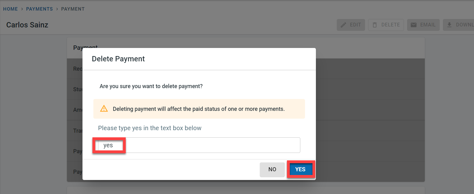 The payment can be deleted from the system by clicking on delete. Enter “yes” in the popup and click on yes to confirm the deletion of the payment