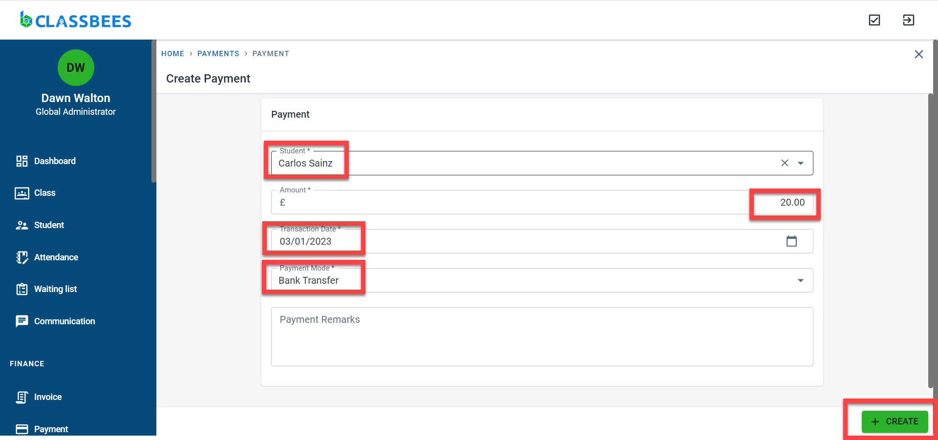 In the payment screen, Enter the student name (only if you have started off from the payment screen), payment amount, the date when the payment was made, payment mode, and remarks if any.