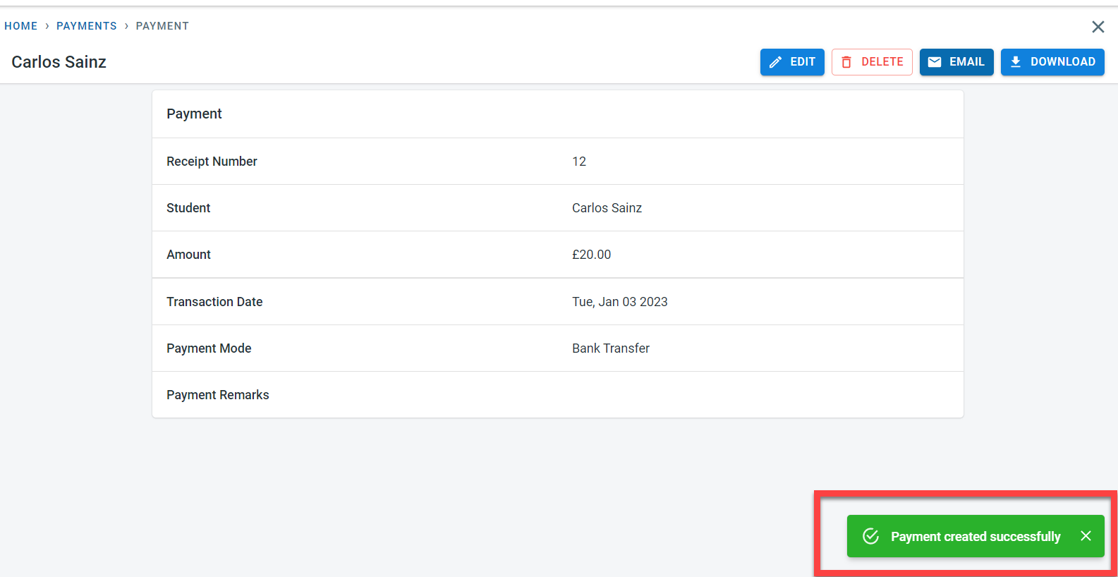 A message would be displayed to confirm that the payment has been recorded in the system