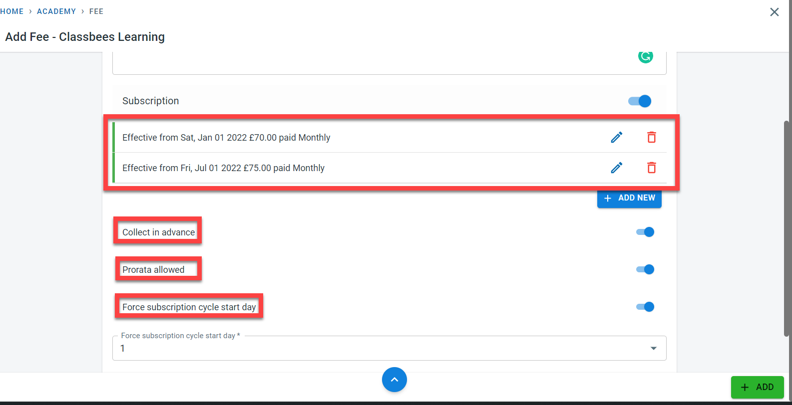 Click on “ADD” to save the subscription fees