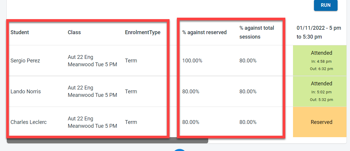 The % against total session is the percentage of classes attended by the student divided by the total number of sessions in the data range. In the image below, there were a total of 5 classes between the report execution date range and Sergio Perez attended only 4 classes so the % was 80%