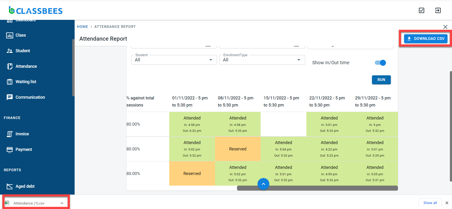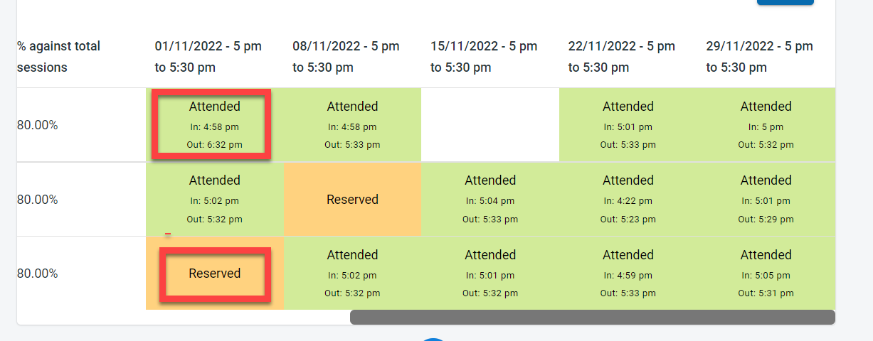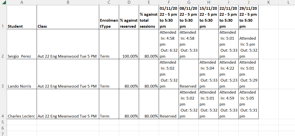 If the session was not reserved by the student, the session for the student would be shown as blank. If the student has reserved a session but had not attended the session it will be displayed as “Reserved”. If the student attended the session, the session will be marked as “Attended” . If the “Show in/Out time” was selected for the class when executing the report, the in and out time for each student for the session will be displayed.