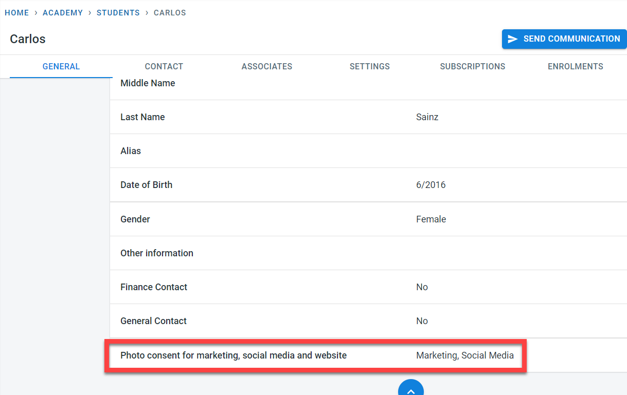 Photo consent for the student for marketing, social media, and website can be recorded on the student’s general screen.
