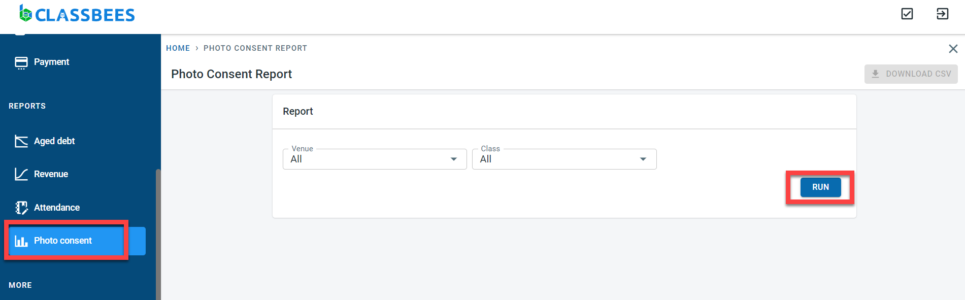 There are no mandatory fields in this report. You can limit the data displayed by selecting a specific venue or specific class. Click on Run.