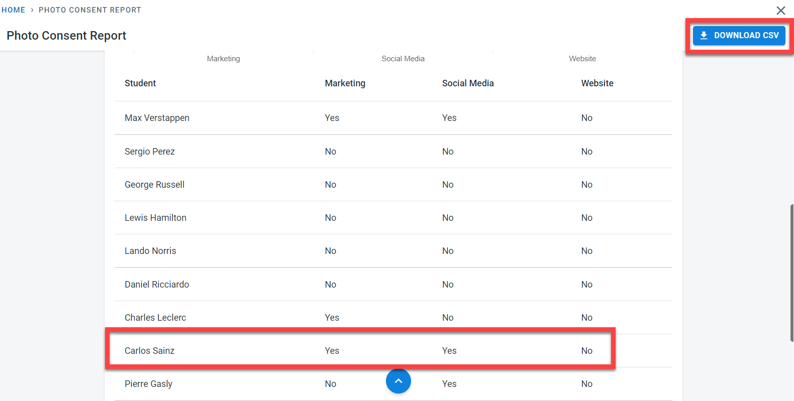 The photo consent report provides a quick summary of the student’s photo consent for marketing, social media, and website.