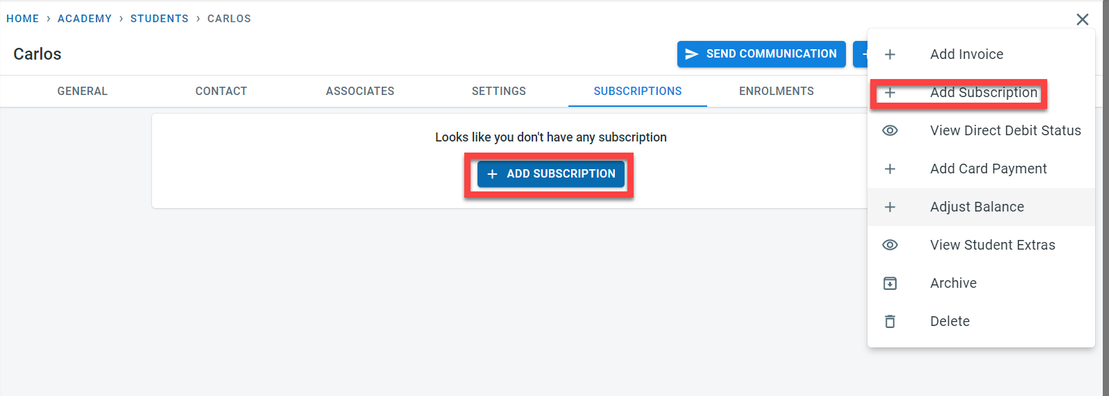 Click on “Add Subscription” for the student.