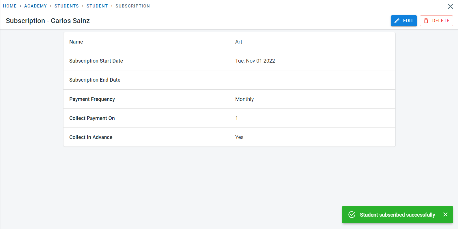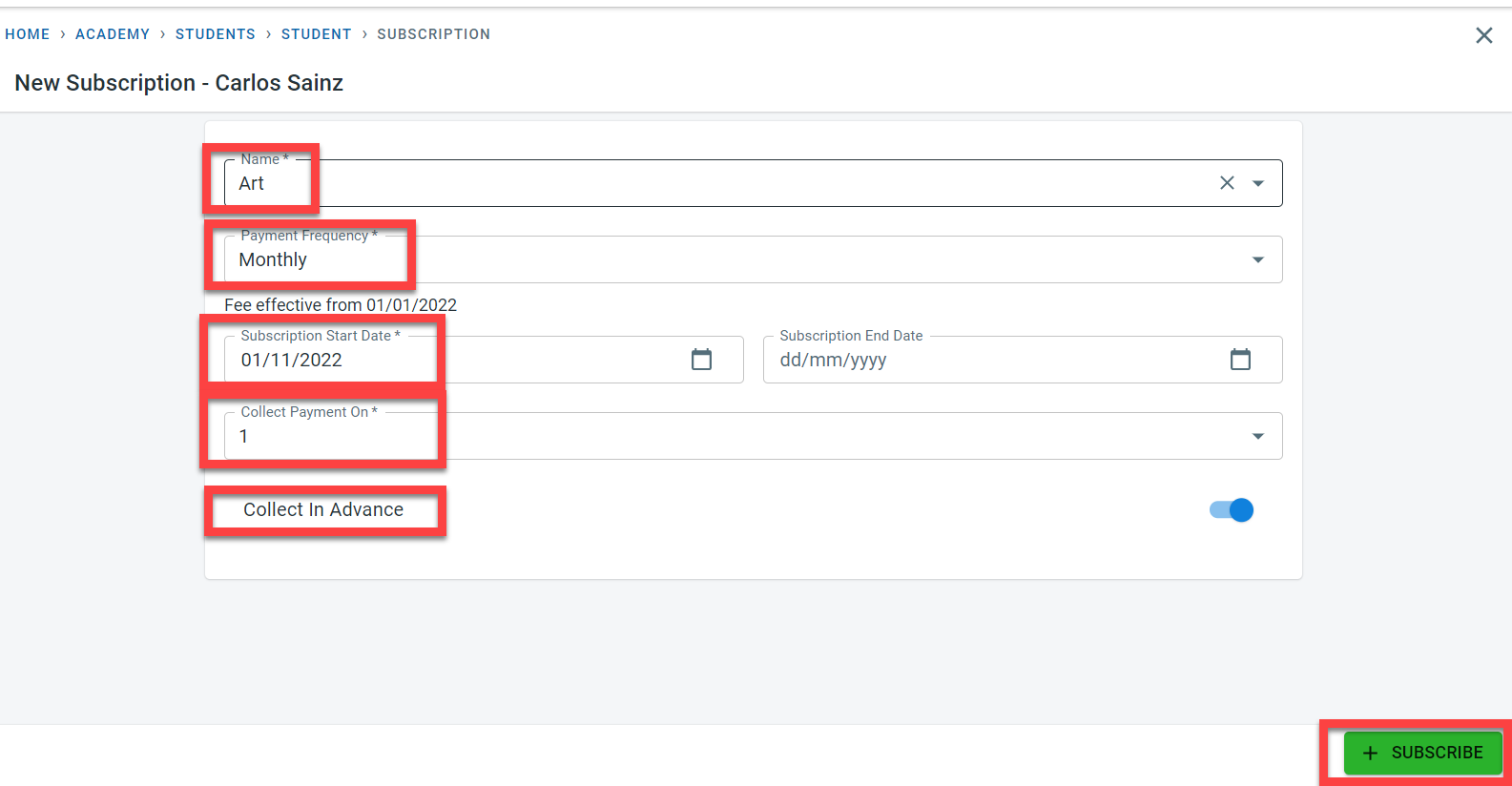 Select the subscription defined at the academy level for the student and the payment frequency defined for the subscription.